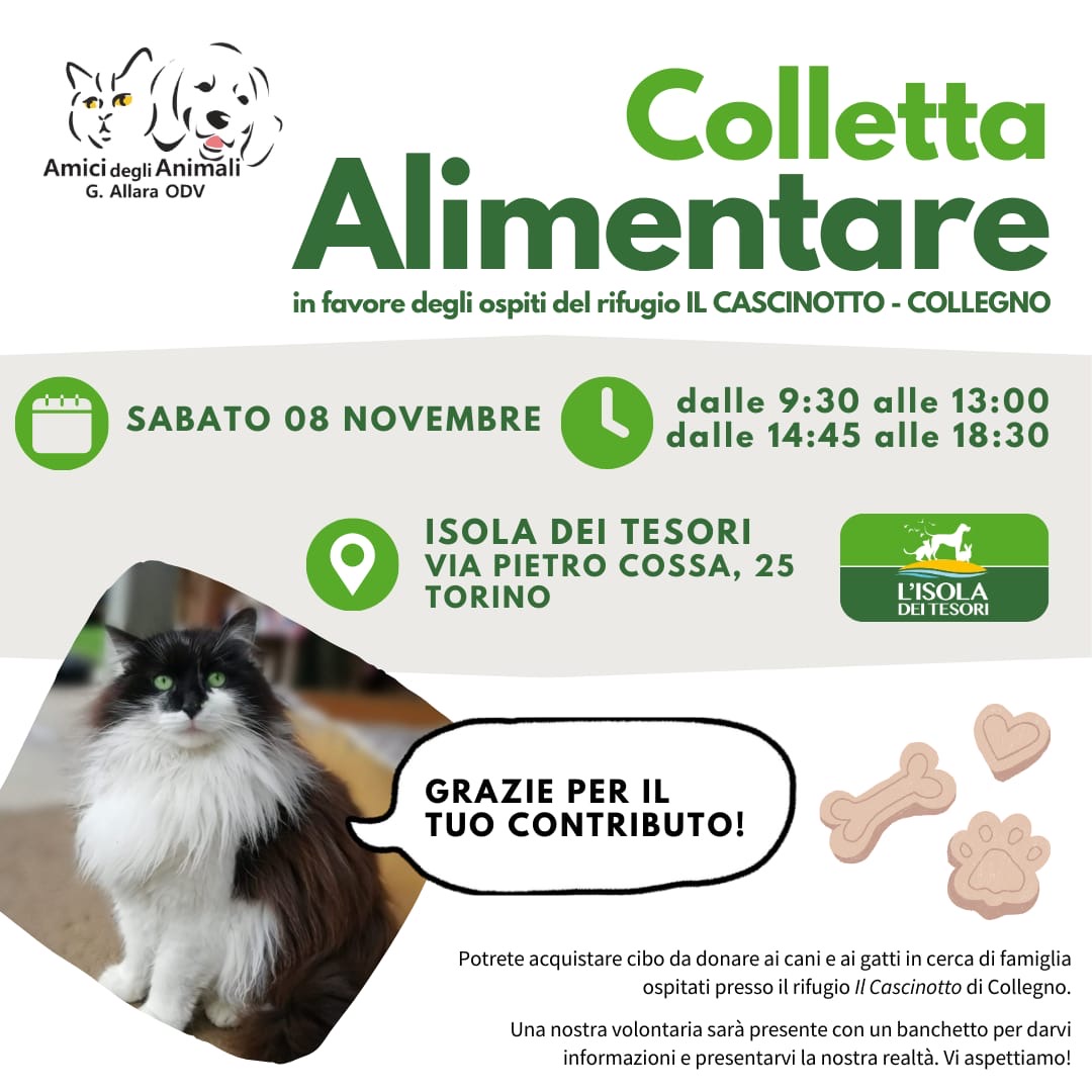 Sabato 8 novembre saremo presenti presso L’Isola dei Tesori in Via Pietro Cossa 25, Torino, per una colletta alimentare a favore dei nostri amici a quattro zampe!